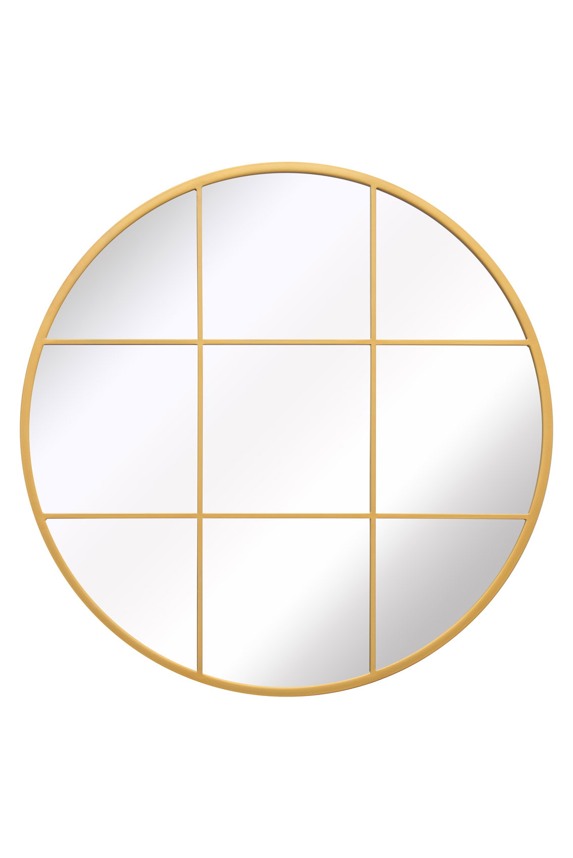 This round mirror features a warm gold metal frame and a nine-panel windowpane grid, giving a fresh industrial vibe. Its slim profile and sturdy backing make it perfect for indoor or outdoor walls, reflecting light beautifully.