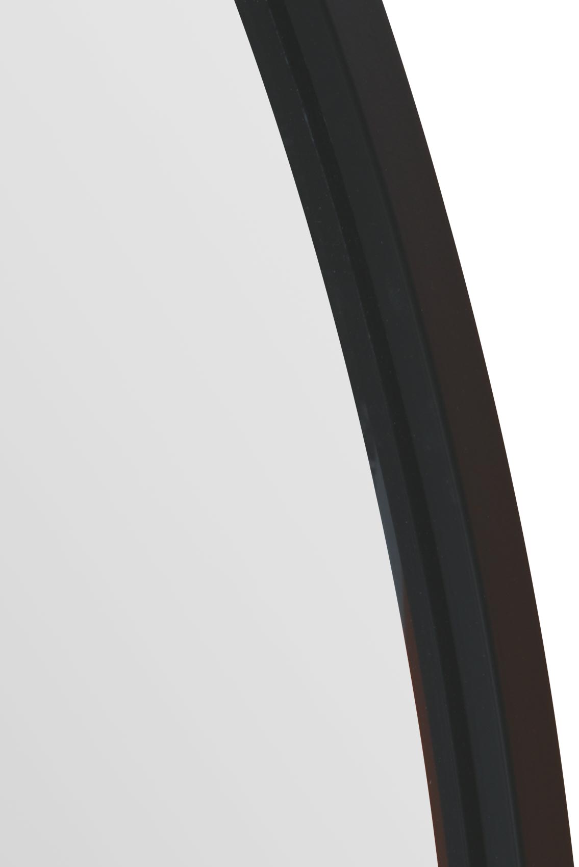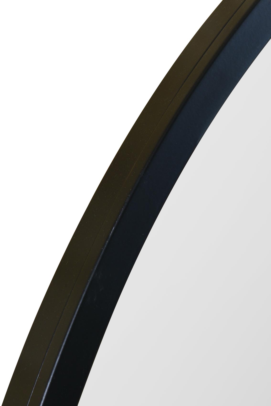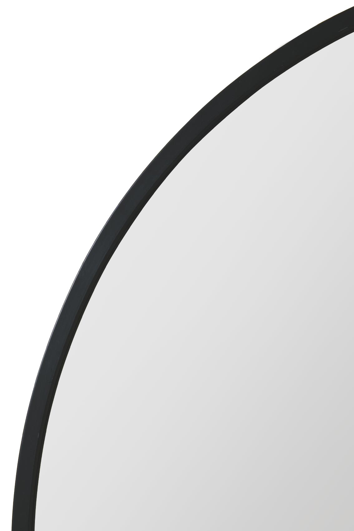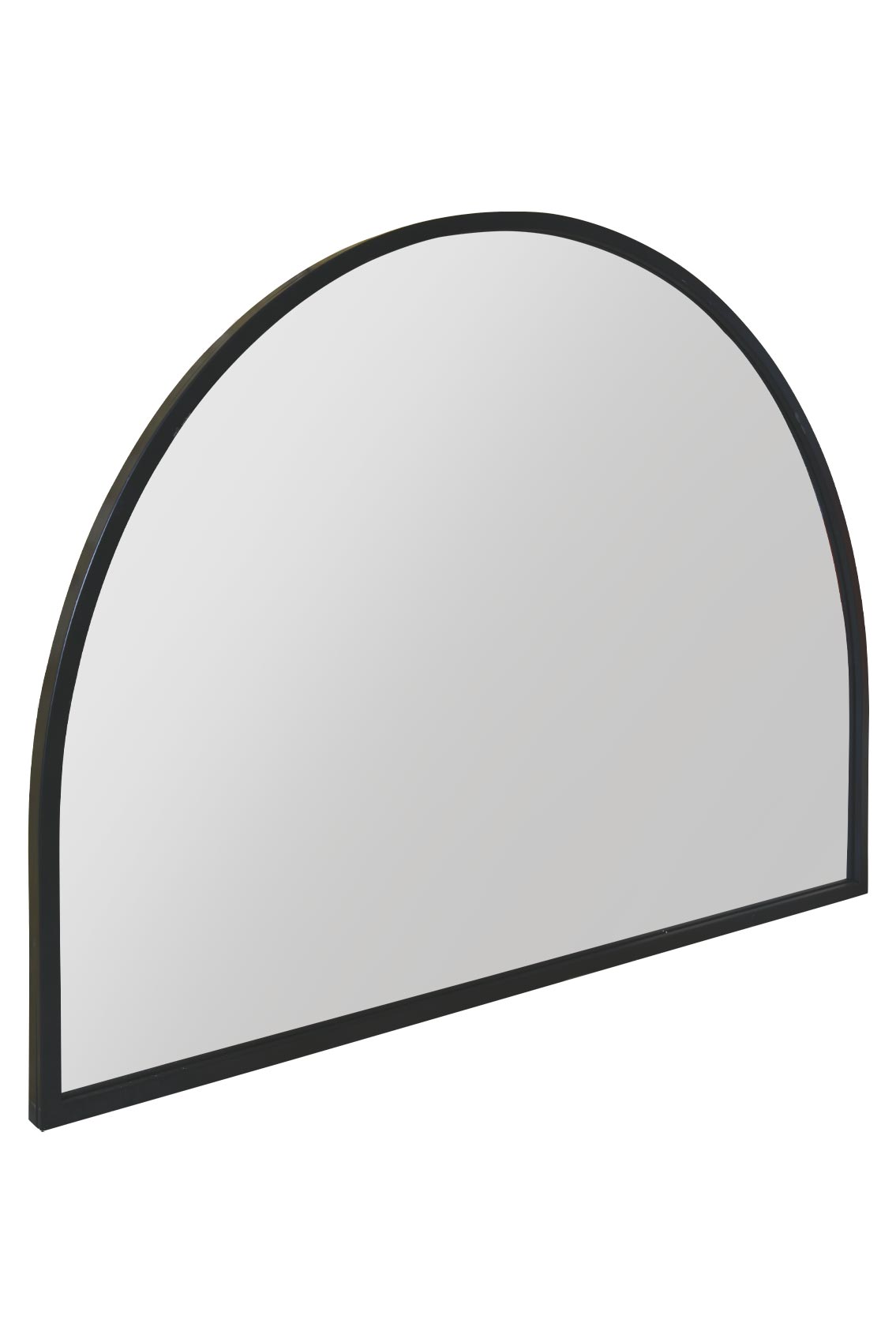 Make a statement with this sleek half-moon arch mirror. Its slim matte black metal frame surrounds a crisp reflective surface, adding modern edge to any wall. Ideal for freshening up indoor lounges or outdoor garden spaces.