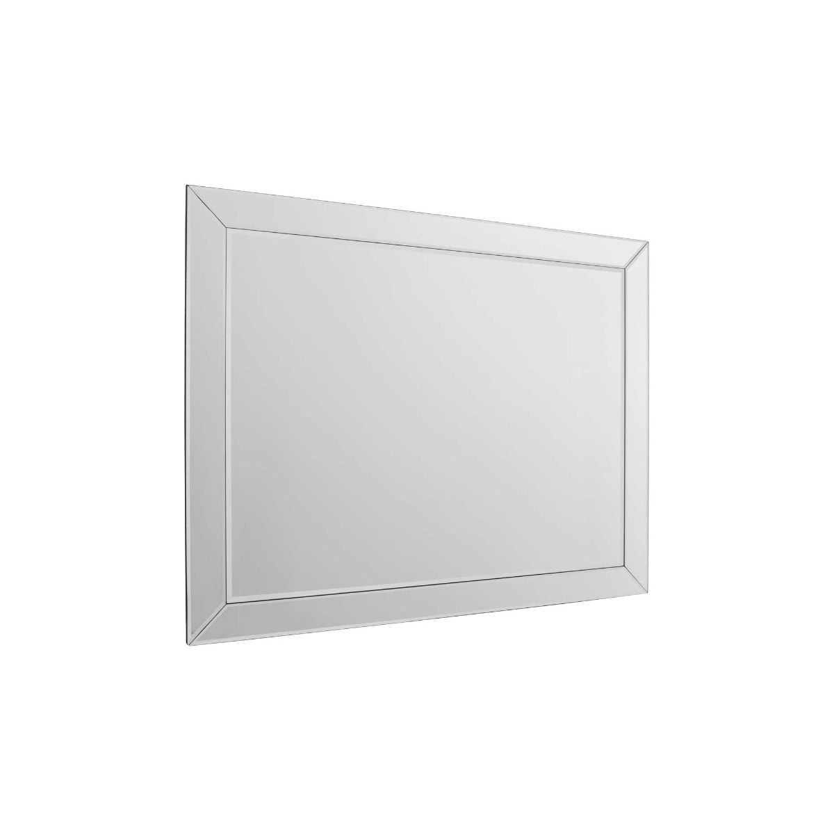 The entire mirror front including the central panel feature all-glass bevelled segments. A hardwood backing supports the entire mirror, enveloped in a neutral, soft black felt layer for a refined surround.