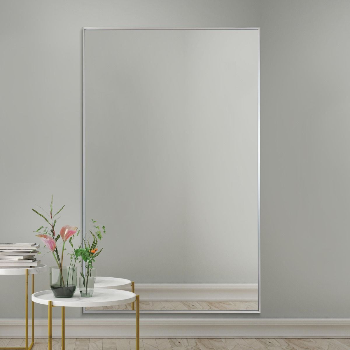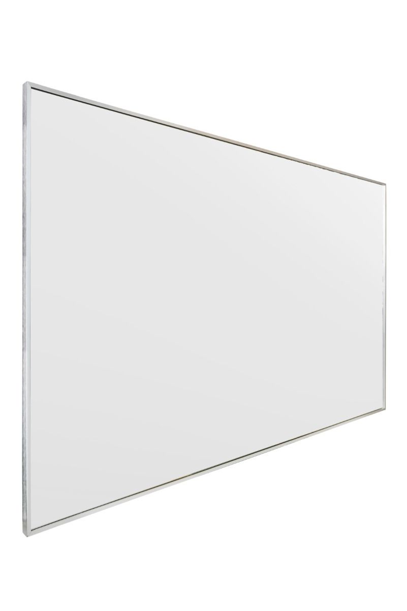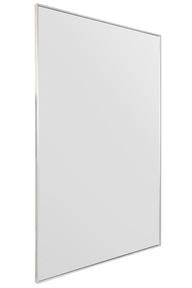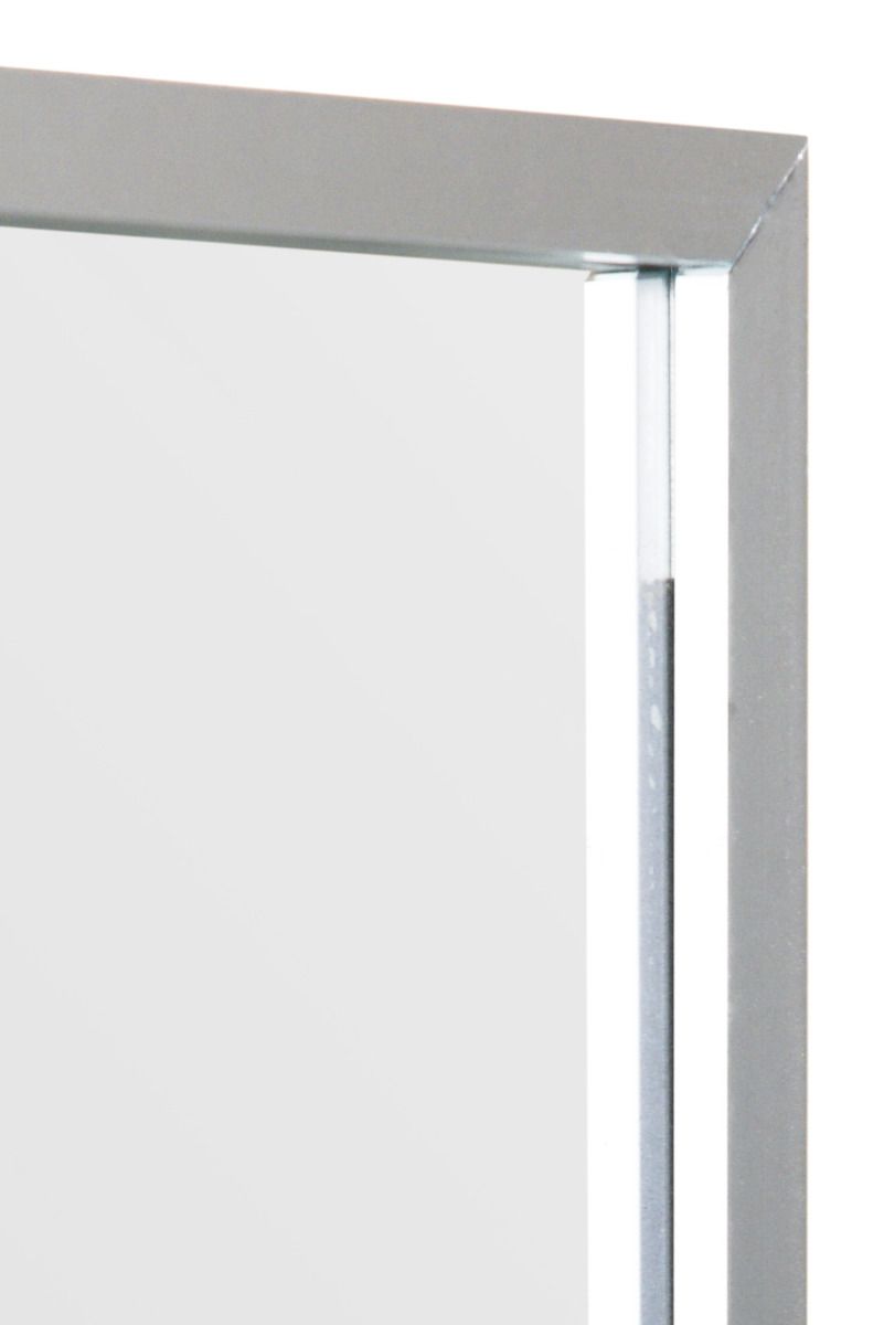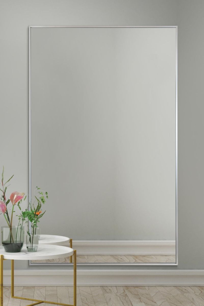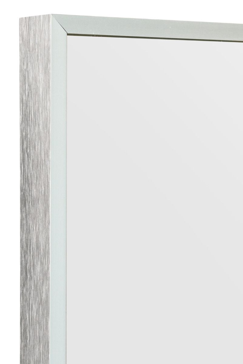 This Arlington silver leaner mirror radiates joy with its brushed aluminium narrow frame, emanating a truly ultra-modern and sleek ambiance.